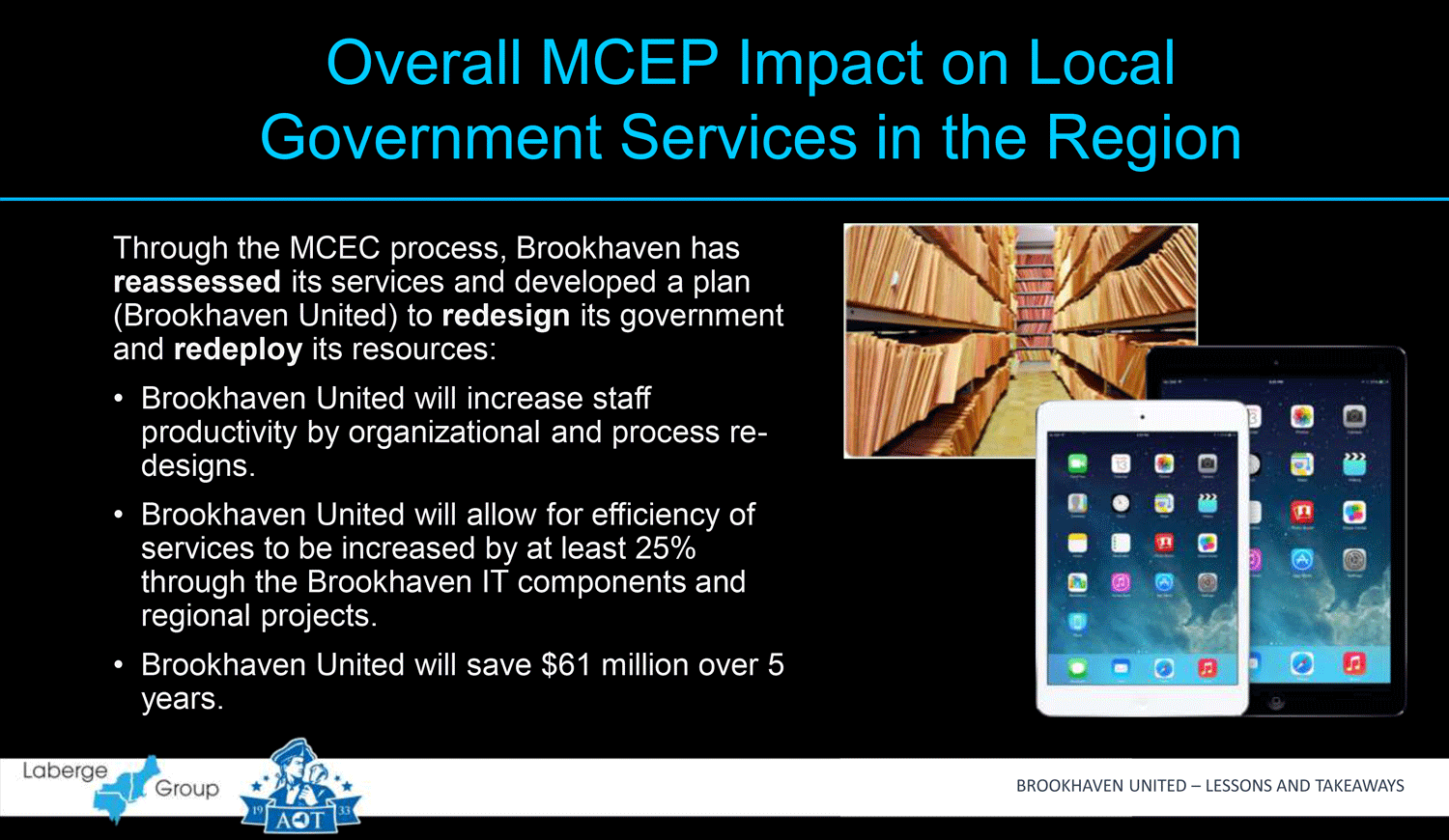 At a time when communities throughout New York State are searching for solutions to increase efficiency, bolster productivity, and deliver savings to their taxpayers, Laberge Group and the Town of Brookhaven delivered a presentation detailing lessons gleaned from the $19.7 million award winning entry to the Municipal Consolidation and Efficiency Competition (MCEC). This sole MCEC grant was awarded in recognition of the visionary government efficiency solutions outlined in a plan aptly named Brookhaven United, and the potential for many of the government redesign strategies outlined in this plan to be effectively implemented in communities throughout New York State. These solutions, which have been estimated to save the Town of Brookhaven and their villages and special districts over $61 million over 5 years, included initiating strategic local government consolidation, identifying opportunities effective shared services, and implementing local government modernization.