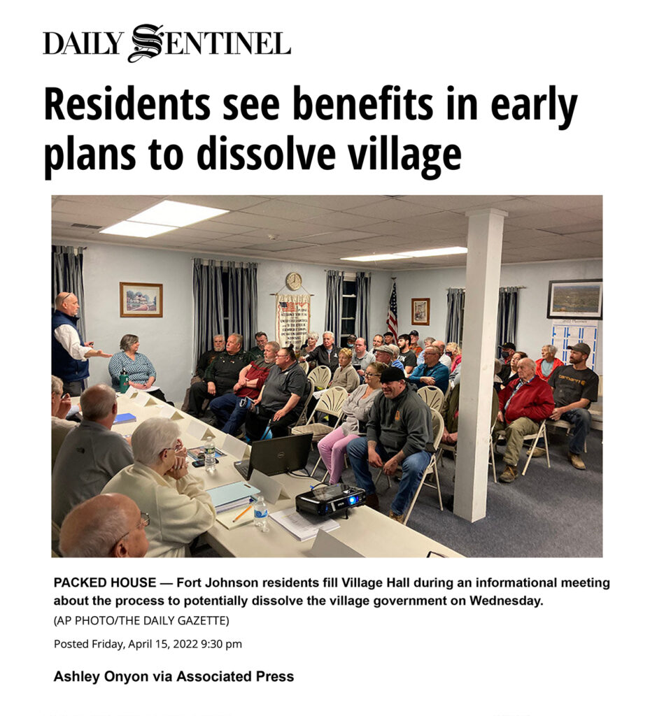 Addressing a packed house at Fort Johnson Village Hall last week, Laberge Group Government Operations & Efficiency experts Ben Syden, AICP and Kathleen Rooney explained the process of a Board-initiated Village Dissolution as well as the development of a Proposed Dissolution Plan currently underway.